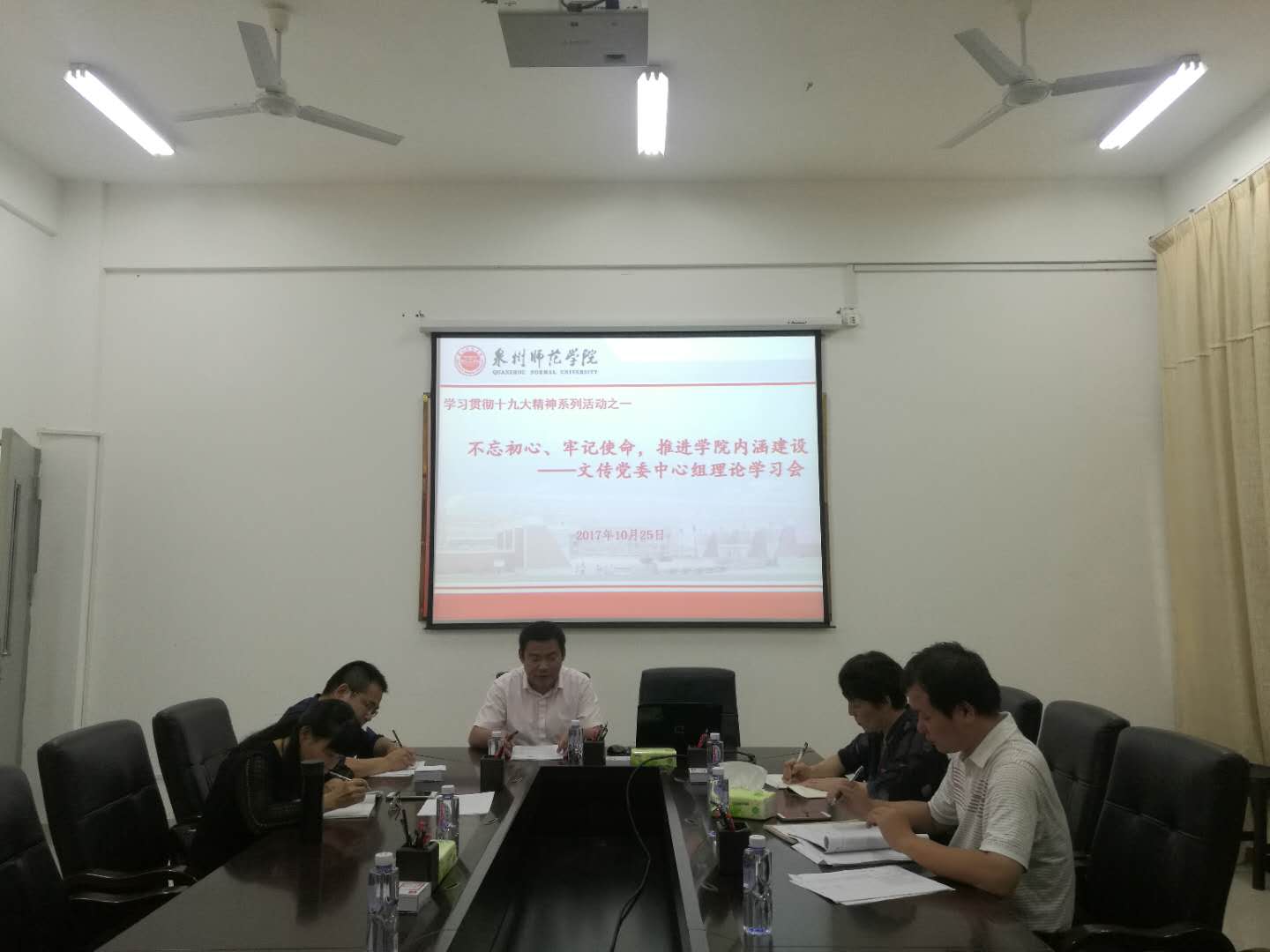在党的十九大胜利闭幕之际,10月25日,文学与传播学院于院会议室召开了以“不忘初心、牢记使命,推进学院内涵建设”为主题的党委中心组理论学习会。会议组织学习党的十九大报告全文,讨论如何以知促行,推进学院的内涵建设。本次会议由党委书记王勇卫主持,党委委员参加。