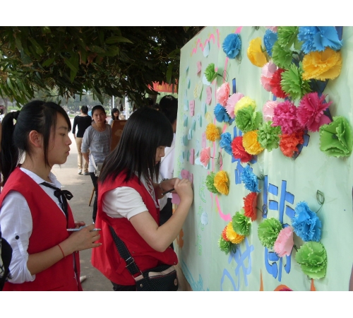 活动现场洋溢着节日的温馨与喜庆。在志愿者们的指导下,同学们用细心与耐心将五颜六色的纸片浇灌出一朵朵美丽的康乃馨,展板上五颜六色的康乃馨拼成“心”型,象征着同学们对母亲深深的爱意。随后,同学们将对母亲的款款深情汇成一句话书写在留言板上。持续两个小时的活动传递的是真情更是感动。