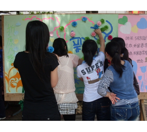在一年一度的母亲节来临之际,外国语学院剪纸协会和青年志愿者协会于5月8日中午在奎生超市前的校道联合举办“母亲节折康乃馨送祝福”活动,同学们用亲手制作的康乃馨表达心中对母亲无限的感恩之情。