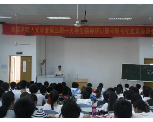 6月21日下午,物理与信息工程学院人文学堂第三期——大学生精神研讨暨考风考纪教育座谈会在理工楼218多媒体教室举办。学院辅导员老师、全体学生党员、主要学生干部共100多人参加了座谈会。研讨座谈会由学院党总支书记陈晏辉主持。