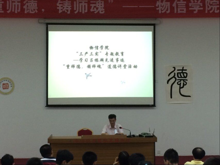 为了进一步弘扬高尚师德,切实担负起教书育人的重任,以良好的师德形象教育学生,按照院党委的安排,6月18日下午我院在中山礼堂第一学术报告厅,开展学习吕榕麟先进事迹“三严三实”专题教育暨“重师德,铸师魂”为主题的道德讲堂活动,学院全体教职工和师范生约200人参加了此次活动。