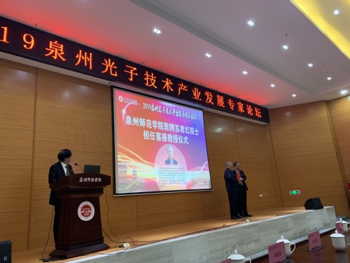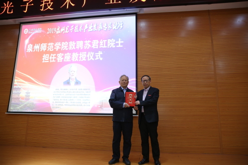 2019年11月26日,在2019泉州光子技术产业发展专家论坛开幕式上,我校举行了敦聘苏君红院士为泉州师范学院客座教授仪式,泉州师范学院校长屈广清教授向苏君红院士颁发了泉州师范学院客座教授聘书。