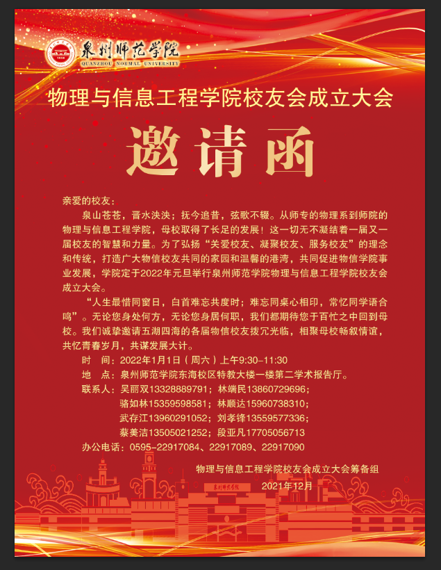 泉山苍苍,晋水泱泱;抚今追昔,弦歌不辍。从师专的物理系到师院的物理与信息工程学院,母校取得了长足的发展!这一切无不凝结着一届又一届校友的智慧和力量。为了弘扬“关爱校友、凝聚校友、服务校友”的理念和传统,打造广大物信校友共同的家园和温馨的港湾,共同促进物信学院事业发展,学院定于2022年元旦举行泉州师范学院物理与信息工程学院校友会成立大会。