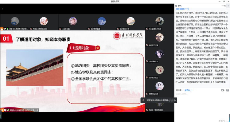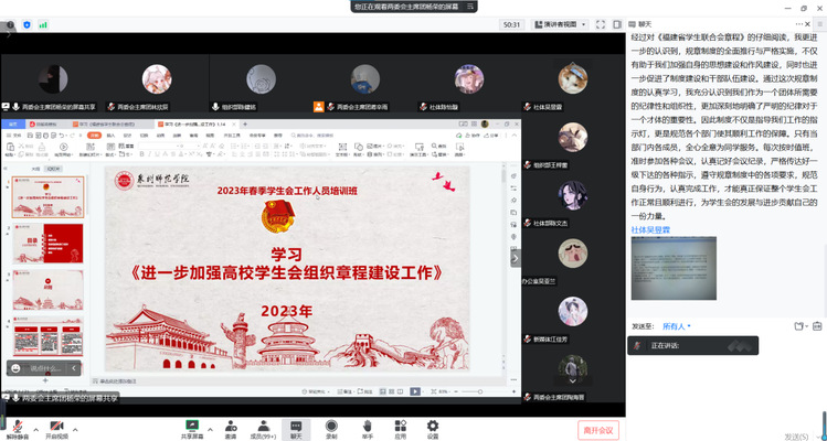 培训围绕“主责主业重聚焦,踔厉奋发再前行”主题,分为三大专题对学生会工作人员开展规章制度、团史学习、重要讲话精神等培训。会议旨在推动学生会深化改革,落实学生会指导管理责任,加深学生干部对学生会章程的了解,同时让全体成员以史为鉴、展望未来。大家踊跃发言,发表个人感悟与心得体会。