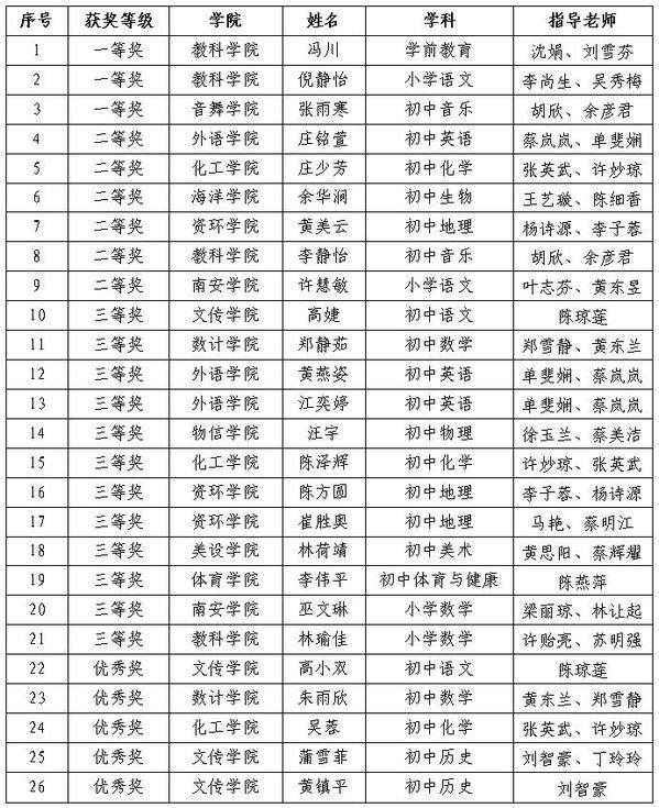 3月18日至19日,第九届福建省高校师范生教学技能大赛在闽南师范大学举行。来自全省32所高校、16个学科的251名师范生同场竞技,我校冯川、倪静怡、张雨寒等26位同学凭借现场出色发挥,获得一等奖3项、二等奖6项、三等奖12项、优秀奖5项,学校获优秀组织奖,教育科学学院沈娟、音乐与舞蹈学院胡欣获优秀指导教师。