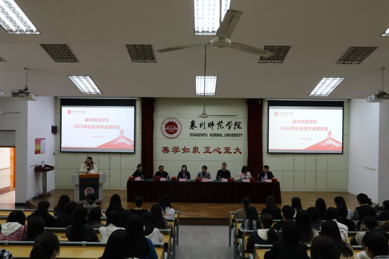 主席台上老师为陈笃彬教育奖学金、贤銮奖学金、泉州市关工委千墅奖学金、泉州市慈善总会师范学院奖助学金、泉州市教育基金会优秀大学生奖助学金等270获奖学生颁发荣誉证书