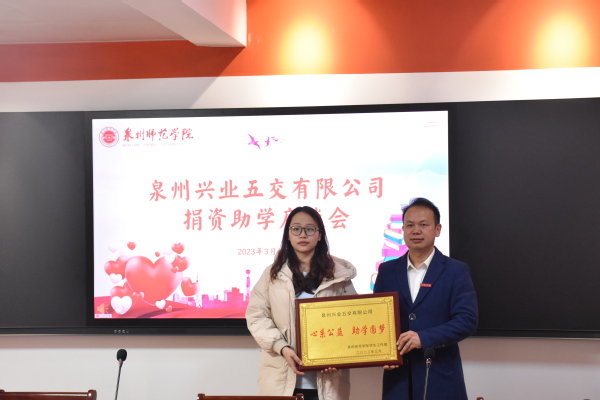 泉州兴业五交有限公司代表张婷蓉、陈芸泽为10名品学兼优的家庭经济困难学生送去助学金,并介绍了公司董事长陈佩萱女士的公益慈善理念,勉励受助学生守初心、持恒心,刻苦学习、严格要求、奋发向上。
