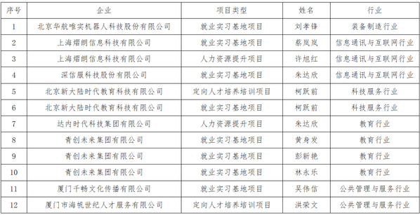 我校此次成功入选的12项供需对接就业育人项目涵盖了3大类别,5大行业,其中,定向人才培养培训项目2项,就业实习基地项目8项,人力资源提升项目2项。分别由教务处、学工部和各相关二级学院牵头负责,项目建设与学校专业设置和学生就业方向高度一致,是学校前期产教融合、就业育人工作的延伸和赋能。