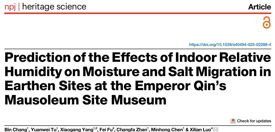 近日,我校泉州文化遗产研究院常彬博士在Nature旗下合作期刊《npj Heritage Science》发表题为《Prediction of the Effects of Indoor Relative Humidity on Moisture and Salt Migration in Earthen Sites at the Emperor Qin's Mausoleum Site Museum》的学术论文。我校为第一署名单位,常彬博士为第一作者,西安交通大学罗昔联教授为通讯作者,并联合秦始皇帝陵博物院等单位共同完成。