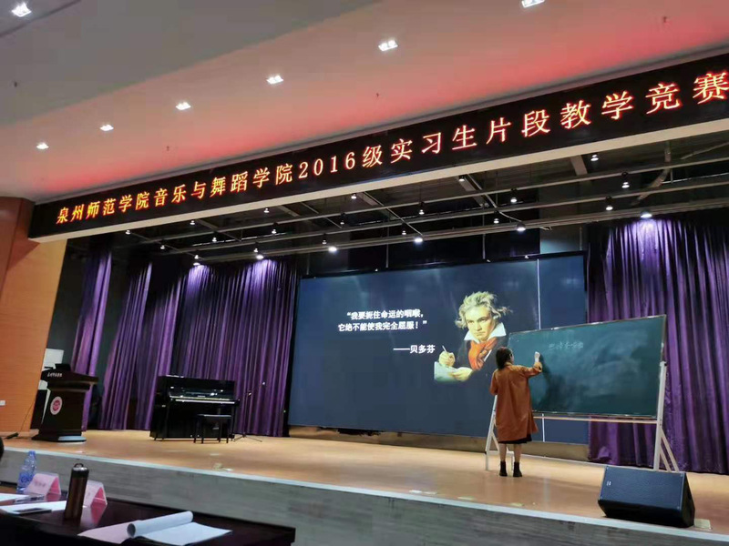 为展现我院师范生教育实习成果,促进师范生专业素养成长,彰显师范类专业认证“学生中心、产出导向、持续改进”的理念,12月26日下午,音乐与舞蹈学院在特教大楼第一学术报告厅举办了2016级实习生片段教学竞赛,邀请来自泉州七中、培元中学、师院附中、华大附中的多位具有丰富教学经验的一线中学音乐教师与我院教师一同担任评委,吸引了众多教师和学生们到场观摩学习。