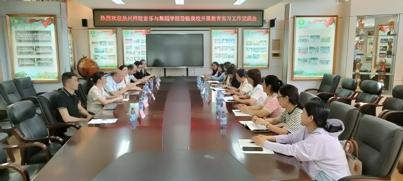 在泉州外国语学校,校王贵斌等热情接待我院一行,王校长亲自带领我院老师们参观泉州外国语学校校史馆和校园文化长廊等,介绍学校概况、办学特色及我院实习生的工作情况,希望双方能在供需对接、人才培养与科学研究、校园文化活动、基地建设、资源互补等方面深化合作,搭建人才培养与毕业生就业平台。苏国柱介绍我院的办学情况,对泉州外国语学校长期支持我院教育实习工作表示感谢,希望贵校对我院实习生严格要求、加强指导,共同探索加强和改进师范生教育实习工作,提高人才培养质量,培养适应行业需求的应用型艺术人才。
