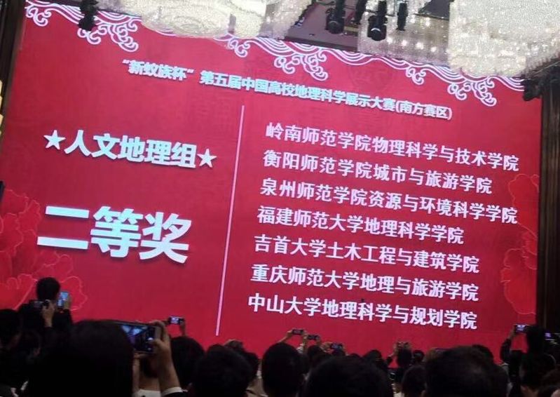 由教育部高等学校地理科学类专业教学指导委员会、中国地理学会、中山大学地理科学与规划学院等单位主办,衡阳师范学院承办、衡阳市南岳区政府协办,“新蚁族杯”第五届中国高校地理科学展示大赛(南方赛区)于2019年10月19日在湖南省衡阳市举行,来自中山大学、南京师范大学、衡阳师范学院等22所高校的42支代表队、近300人参加了本次比赛。