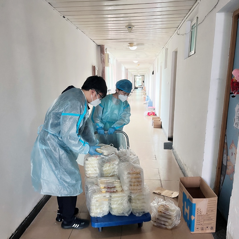作为教师志愿者,他们每日的生活忙碌而充实,从防疫到教学,从送餐到清点分发物资,从了解学生困难到想方设法解决,他们互相鼓劲,相互支持。化身为“快递员”“送餐员”的蔡明江老师与张珊珊老师,每天都与资环学院教师志愿者们不厌其烦地奔波往返于资环学院、学生公寓A区和C区之间,共同为封闭在宿舍的学生们带去一日三餐、水果、面包、泡面等生活物资,分发口罩、消毒水、温度计、中药和抗原自测等防疫物资。一趟趟不惧辛劳的上下搬运,一次又一次的汗湿衣背,他们唯一的想法就是如何为学生提供更加优质高效的服务,让学生们在疫情期间能思想稳、学习稳、情绪稳。