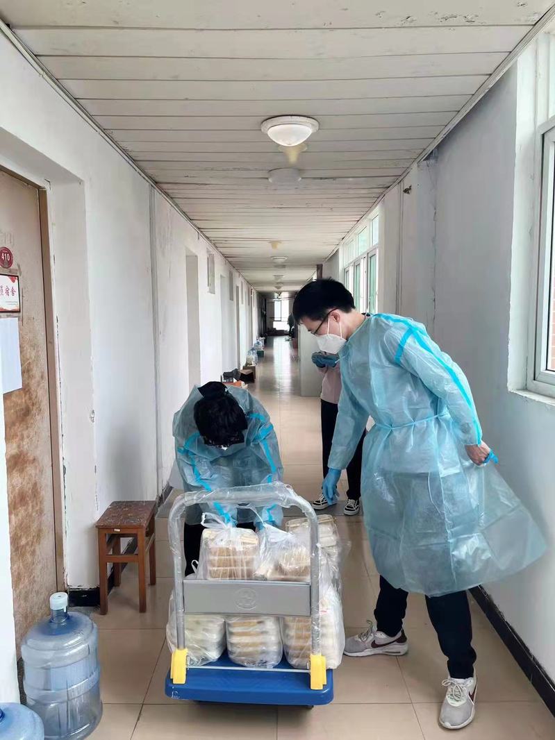 学院领导带领教师志愿者们奔波在学院和学生宿舍之间,只为了给在宿舍封闭的同学们第一时间送去热饭热菜,他们冒雨为同学们分发抗原自测试剂到凌晨3点,他们把同学们急需的生活用品第一时间送到学生宿舍。学生们自发地在宿舍门上贴上自制的手绘卡纸,写上暖心的标语,表达对老师们的感谢与师生共同抗疫的斗志与决心,师生之间守望相助共同抗疫。