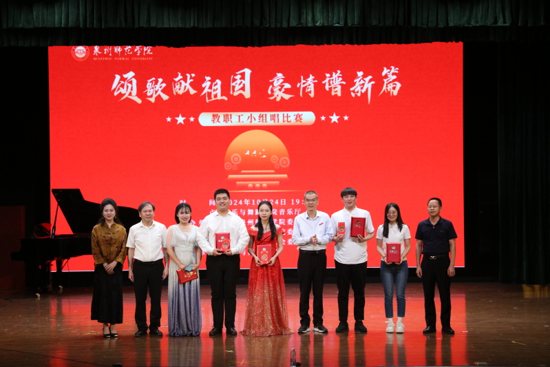舞台上由十二人组成的资环学院代表队以一首《祖国不会忘记》深情演绎了泉师人对祖国的深情告白以及为建设学校一流应用型大学的坚定信心,代表队所表现真挚的情感和动人的歌声,唱出了新时代泉师人守正创新的良好精神风貌,让现场观众深受感动,掌声雷动。