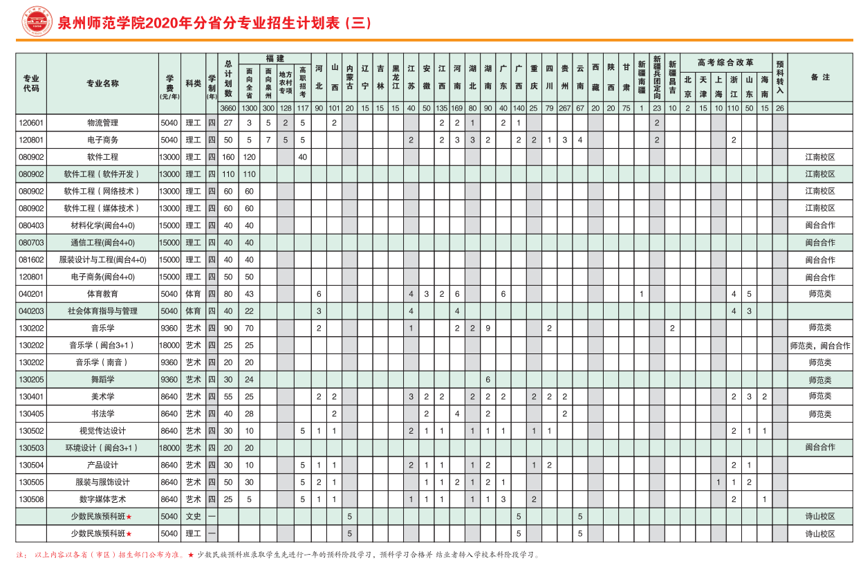 泉州师范学院2020年普通本科分专业招生计划表